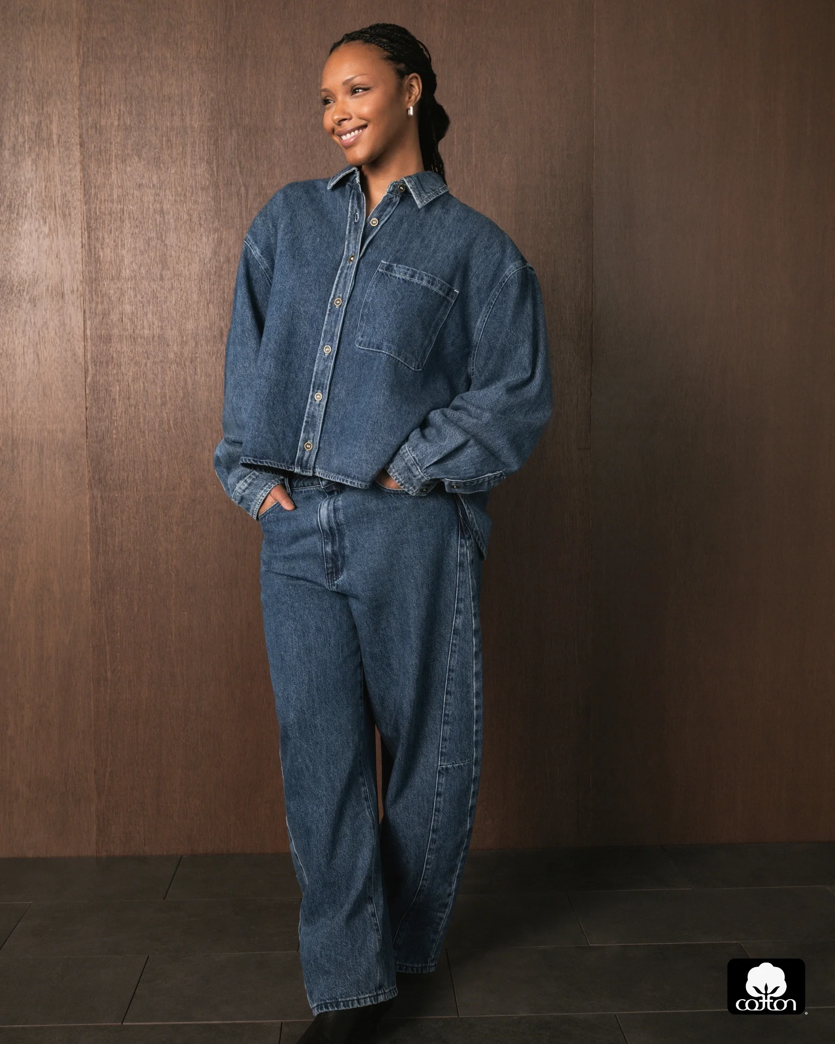 The Boxy Boyfriend Overshirt pairs well with the Mid Rise Barrel Jeans and the Cocoon Barn Jacket.